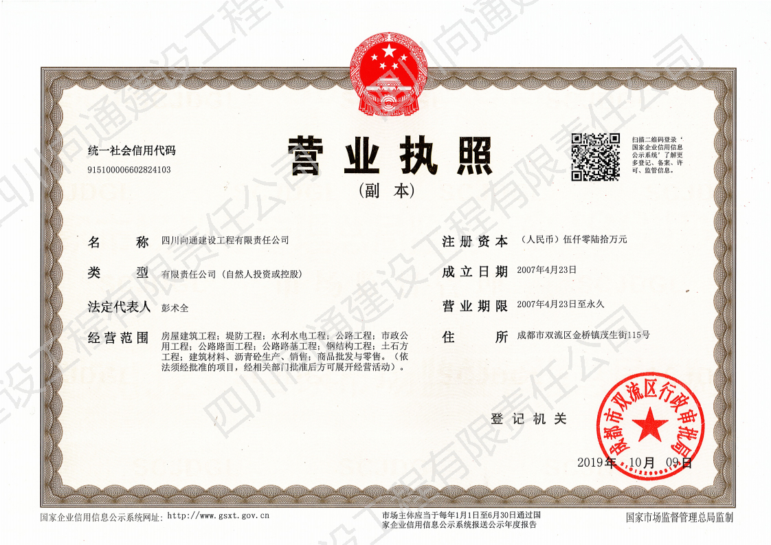 四川向通建設(shè)工程有限責(zé)任公司 四川向通建設(shè)工程有限責(zé)任公司成立于2007年,注冊資本金5060萬元,是一家專業(yè)從事瀝青混合料生產(chǎn)、專業(yè)分包以及市政道路、公路、路基工程專業(yè)施工建設(shè)的企業(yè)。公司注冊地址及生產(chǎn)廠區(qū)位于成都市雙流區(qū)金橋鎮(zhèn)茂生街115號,總占地面積約120畝;辦公地址位于雙流區(qū)海濱城海濱廣場7座11樓。公司生產(chǎn)廠區(qū)(雙流金橋)現(xiàn)有LB-5000型瀝青混合料拌合樓1套,每小時(shí)瀝青混合料生產(chǎn)量可達(dá)380噸。此外,根據(jù)項(xiàng)目需要,公司在多地建立4000型拌合站以服務(wù)施工(廣安齊福、達(dá)州、綿陽等),每小時(shí)瀝青混合料生產(chǎn)量為320噸。各種國內(nèi)外道路施工機(jī)械:攤鋪機(jī)、壓路機(jī)、銑刨機(jī)、灑布車、封層車、吊車、拖車、等70余臺,可滿足各種道路施工需求。公司近100輛保溫運(yùn)輸車輛均安設(shè)保溫板、加塞保溫棉、覆蓋棉絮和隔熱防水雨篷,有效減少瀝青混合料在運(yùn)輸過程中的溫度流失進(jìn)而保證瀝青路面的施工質(zhì)量。 公司目前擁有眾多優(yōu)秀的技術(shù)人才,成熟的市場渠道,良好的企業(yè)聲譽(yù)。現(xiàn)有各專業(yè)施工人才共計(jì)79人;5支專業(yè)的施工班組可根據(jù)現(xiàn)場的具體情況制定實(shí)施性施工方案。今后公司將竭誠為各界客戶提供出色的產(chǎn)品和服務(wù)及具有競爭性的價(jià)格和具有創(chuàng)新精神的高效解決方案。 公司曾經(jīng)榮獲:新津鄧雙段被新津縣政府評為“優(yōu)良工程”;雙流宗申大道被雙流縣政府評為“優(yōu)良工程”;成都后花園被成都市政府評為“重合同守信譽(yù)單位”;被三一重工評為“有遠(yuǎn)見單位”。并在2018年1月被中國五冶集團(tuán)評為“優(yōu)秀供方”;同年3月被四川交投評為2017年度“優(yōu)秀合作單位”的榮譽(yù)。榮譽(yù)的背后是我們公司所有員工堅(jiān)持不懈的努力。 作為現(xiàn)代化的企業(yè),公司將以技術(shù)為切入點(diǎn),以信譽(yù)為支撐點(diǎn),以市場為著眼點(diǎn),促進(jìn)管理創(chuàng)新和技術(shù)創(chuàng)新。因此我公司能在短時(shí)間內(nèi)迅速發(fā)展成為一家擁有各類中大型施工機(jī)械設(shè)備的公司。在今后的工作中我們將借用現(xiàn)代電子信息溝通的便利為公司的發(fā)展助力,同時(shí)將秉承發(fā)揚(yáng)以往的團(tuán)結(jié)拼搏精神,推動公司成為“快穩(wěn)型”發(fā)展的企業(yè)。 在未來的發(fā)展過程中,四川向通始終秉承“以質(zhì)量求生存,以信譽(yù)求發(fā)展”的企業(yè)管理理念,以“啟后為先創(chuàng)佳績,爭做路建行業(yè)標(biāo)”的企業(yè)宗旨與建設(shè)單位建立合作關(guān)系,創(chuàng)造更加輝煌燦爛的明天! 四 川 向 通 建 設(shè)